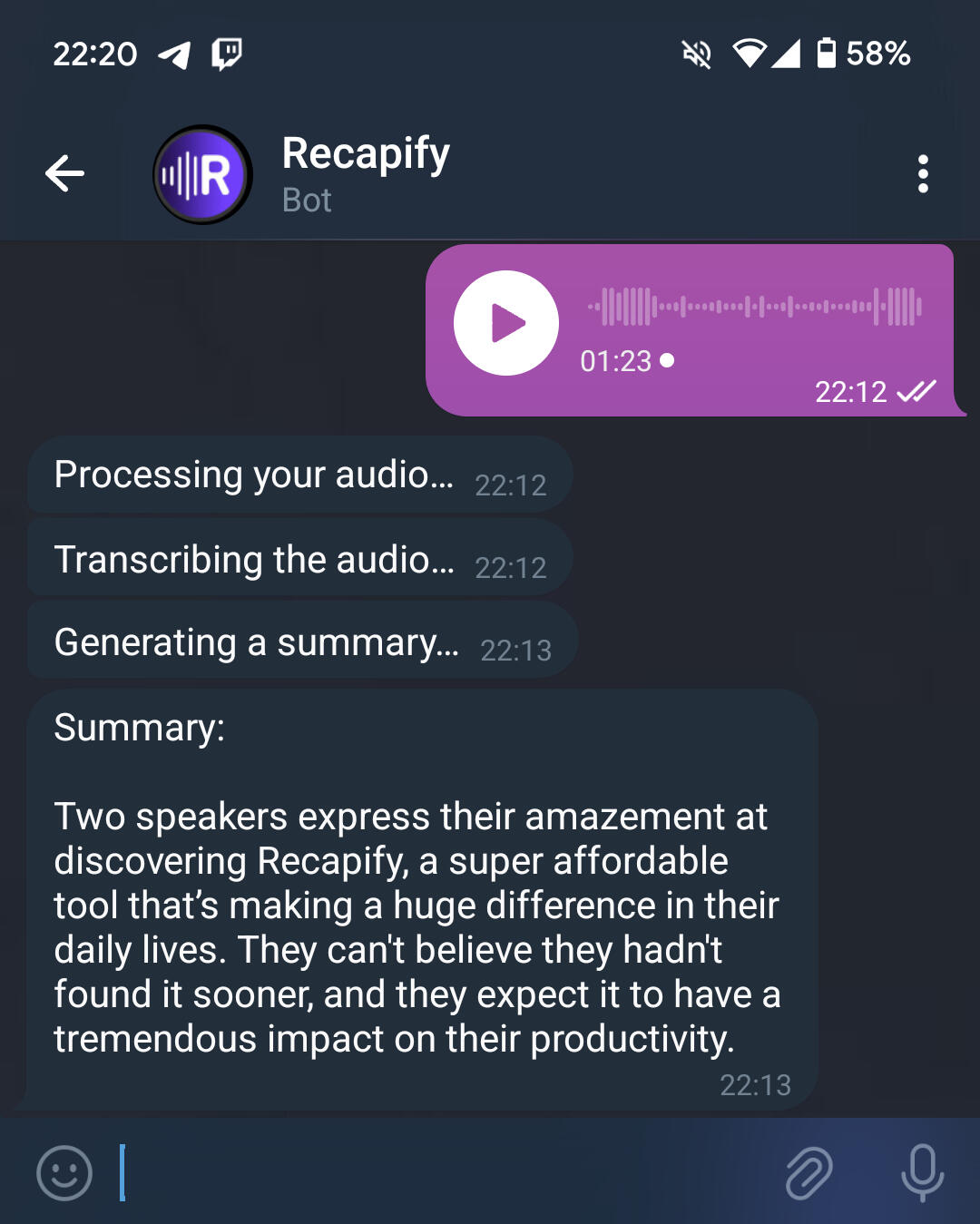 No logins, no downloads – just use Telegram, send your voice message, and get started right away. It’s that simple.